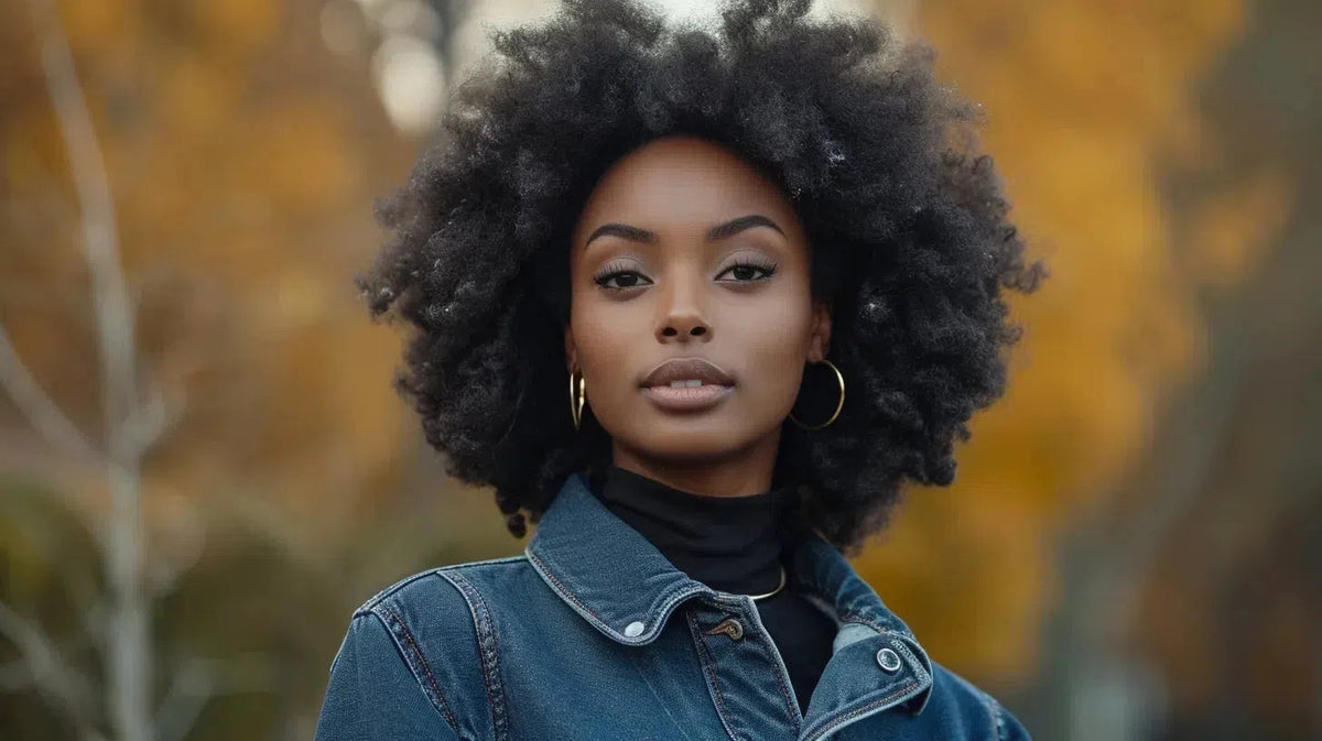 African woman in chic dark denim jumpsuit, outdoor urban setting. Winter  season.