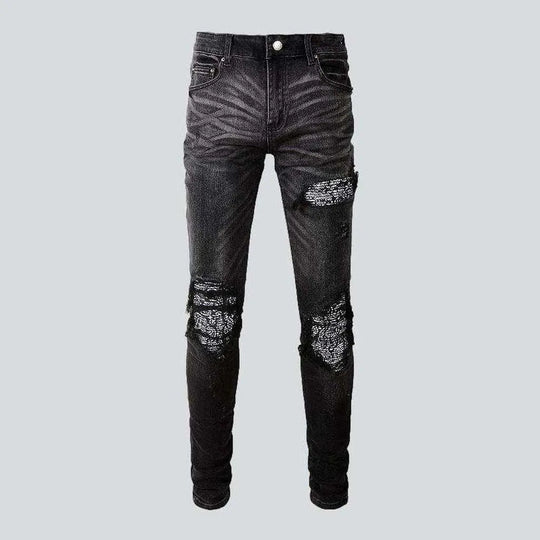 Black leather patch biker jeans