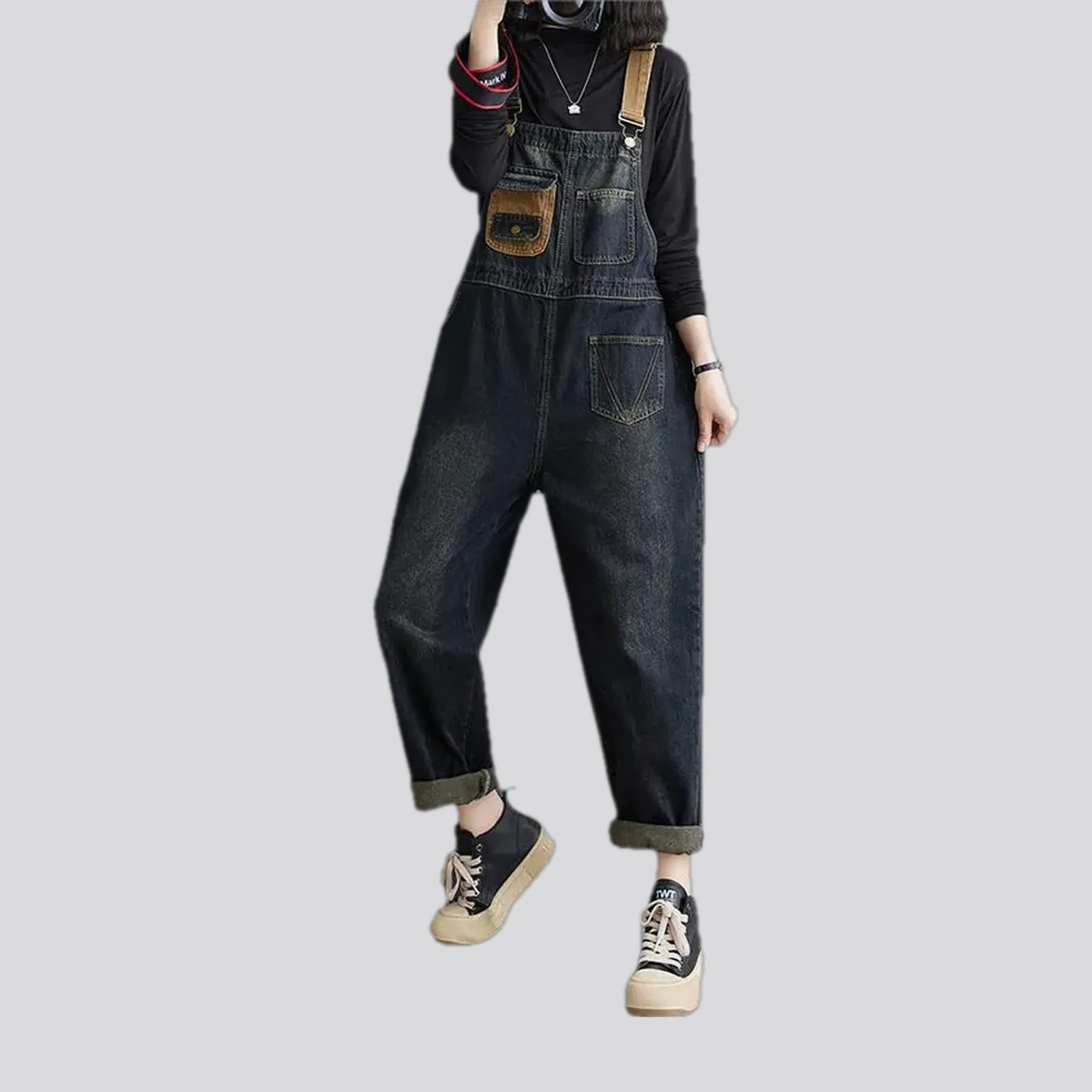 Abraded Pattern Loose Fit Jean Bib for Ladies - Black